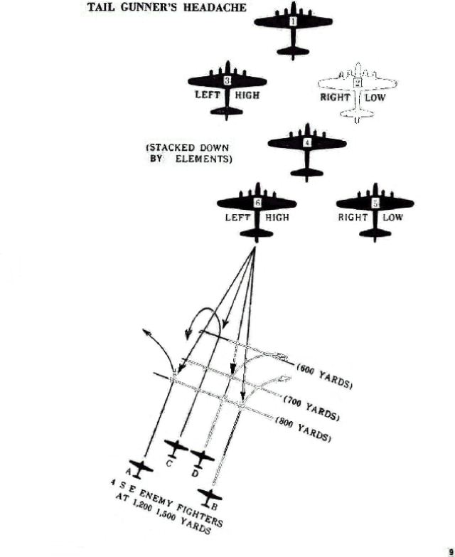 Sometimes (as was done by "Goering's Abbeville Kids" in the Stuttgart mission on 6 September 1943), the dives are extended as indicated by the black lines in diagram, with slow rolls and belly-up dives (Split"S") underneath the squadron. The same diving attacks are often made from the rear of Fortress formaations. FW-190s and Me-109s can and do make these angular attacks, singly and head-on or from astern. Such attacks can be made from any clock position from 10 to 2 or from 4 to 8. TACTICS LESSON A slight turn will make all of these attacks a deflection shot. A slight dive or climb will uncover more turrets. |