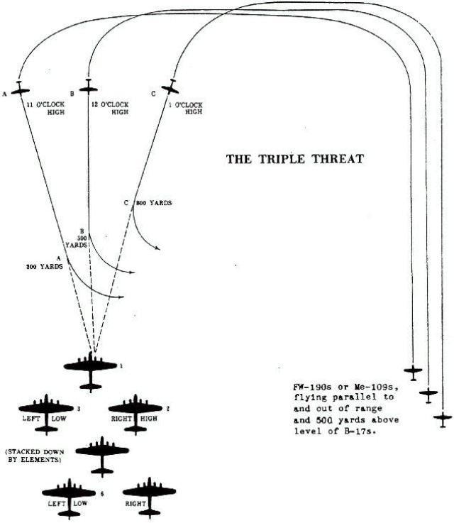 THE TRIPLE THREAT Lead Squadron of High Group, Any Combat Wing TACTICS DESCRIPTION This maneuver, as practically all other head-on attacks, is performed by single engine aircraft. The fighters, flying parallel to Fortresses as indicated in the diagram, pull ahead into positions at 11, 12, and 1 o'clock for commencment of their respective dives. At this time they are approximately 2,000/2,500 yards ahead and 500 yards above the level of the squadron to be attacked. They appear to be converging as they come head-on. Break-aways are made as follows: