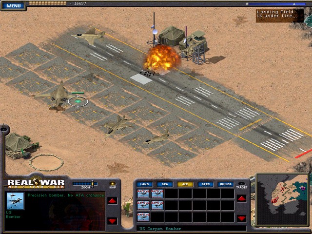 Based on a PC game developed to train the United States military Real War, is a Real Time Strategy (RTS) game, where you can choose to be the United States or a rogue army called “The ILA” (Independent Liberation Army). Each side controls ground, sea, and air units, with the ultimate goal being to beat your enemy using real, modern-day weaponry. Choose from over 50 (for both U.S. and ILA) different units types – from infantry and armored vehicles, to nuclear subs and attack bombers. You can attack their enemy with M1A1s or T80s or go with Special Forces. You can build Air Force bases so planes can land and provide a facility for them. In addition to F16s and B52s, you will also be able to use psychological warfare on the enemy via a special Psyops plane which will drop propaganda on the enemy or use electronic warfare and reconnaissance planes to eavesdrop on the enemy. Release Date: August 2001. Click on images to enlarge.